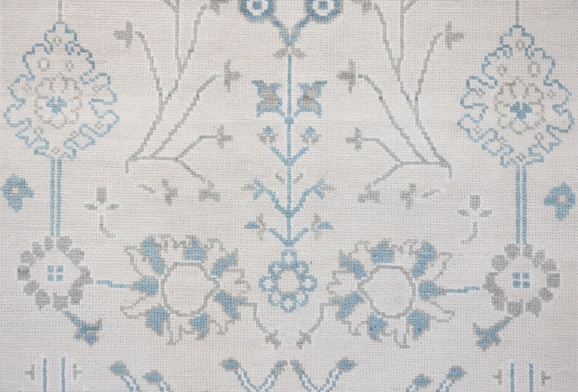 Airy and elegant, the Edith rug captures the essence of relaxed coastal living. Handknotted by skilled artisans, Edith features a light, neutral ground accented with delicate floral motifs in soft sky blue and gentle gray. Its understated palette and graceful pattern make it a versatile choice for beach houses, serene bedrooms, or sun-filled living rooms.