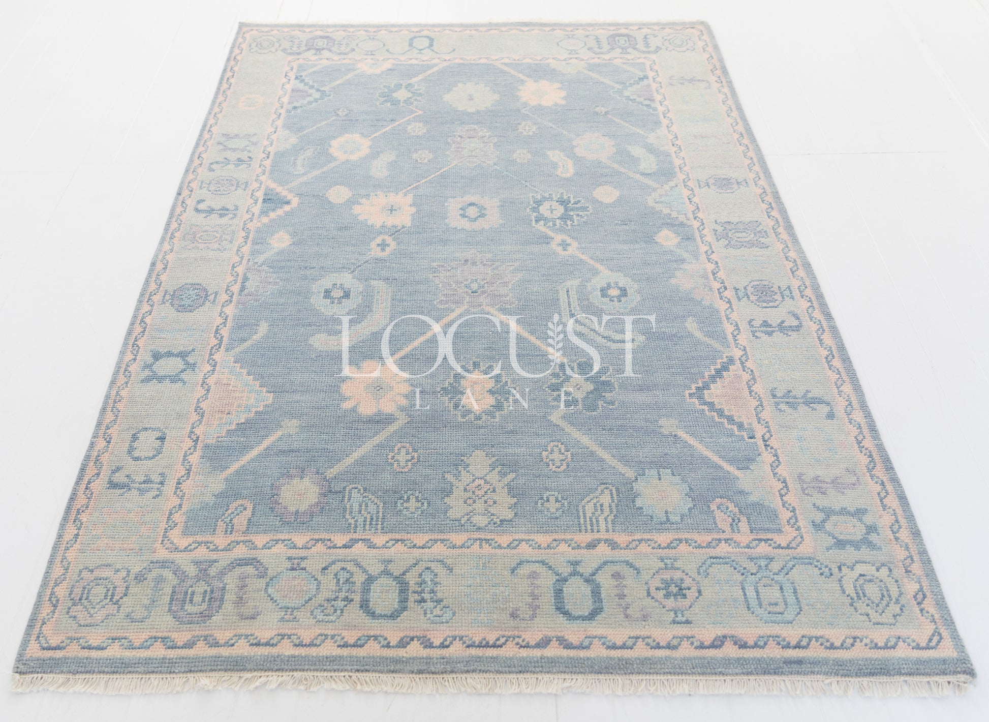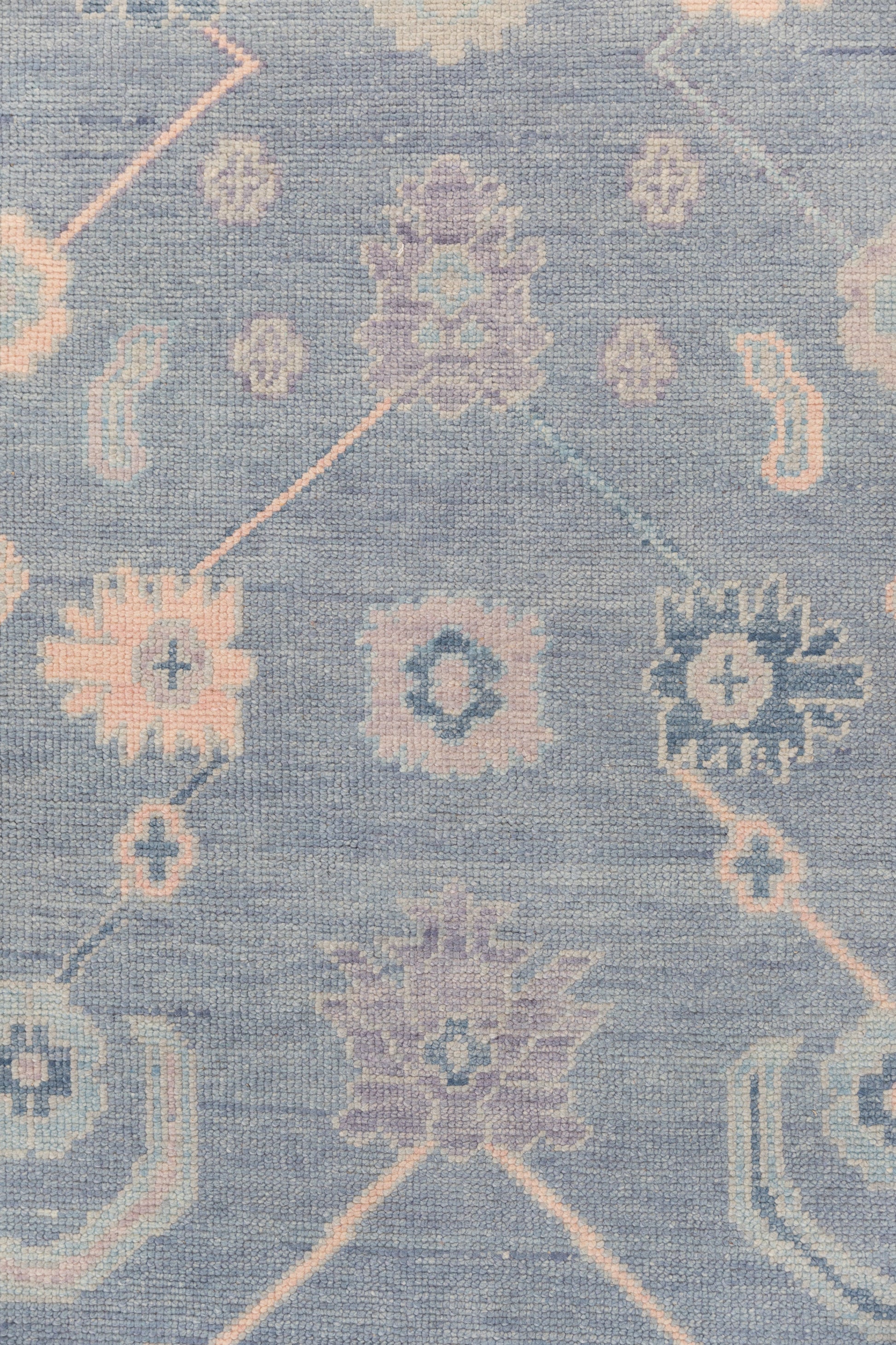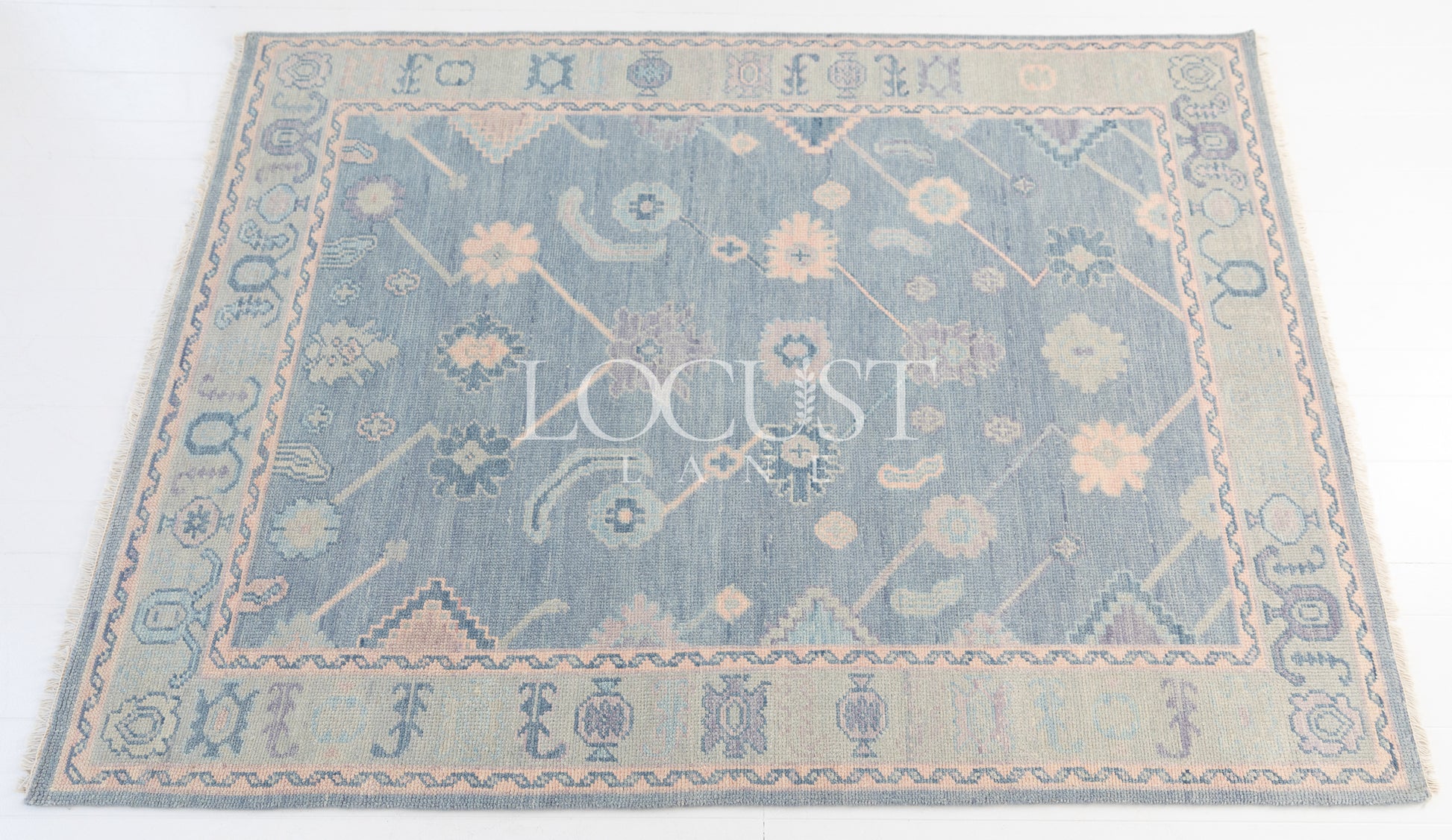 The Eleanor Rug is a timeless statement piece, hand-knotted with the kind of craftsmanship that transforms a room. Its washed denim-blue base is accented with soft peach, sage, and lavender motifs, arranged in a geometric floral pattern that feels both traditional and refreshingly modern. The subtle variations in tone create a lived-in, vintage character, giving it the soul of an heirloom with the versatility for today’s interiors.
