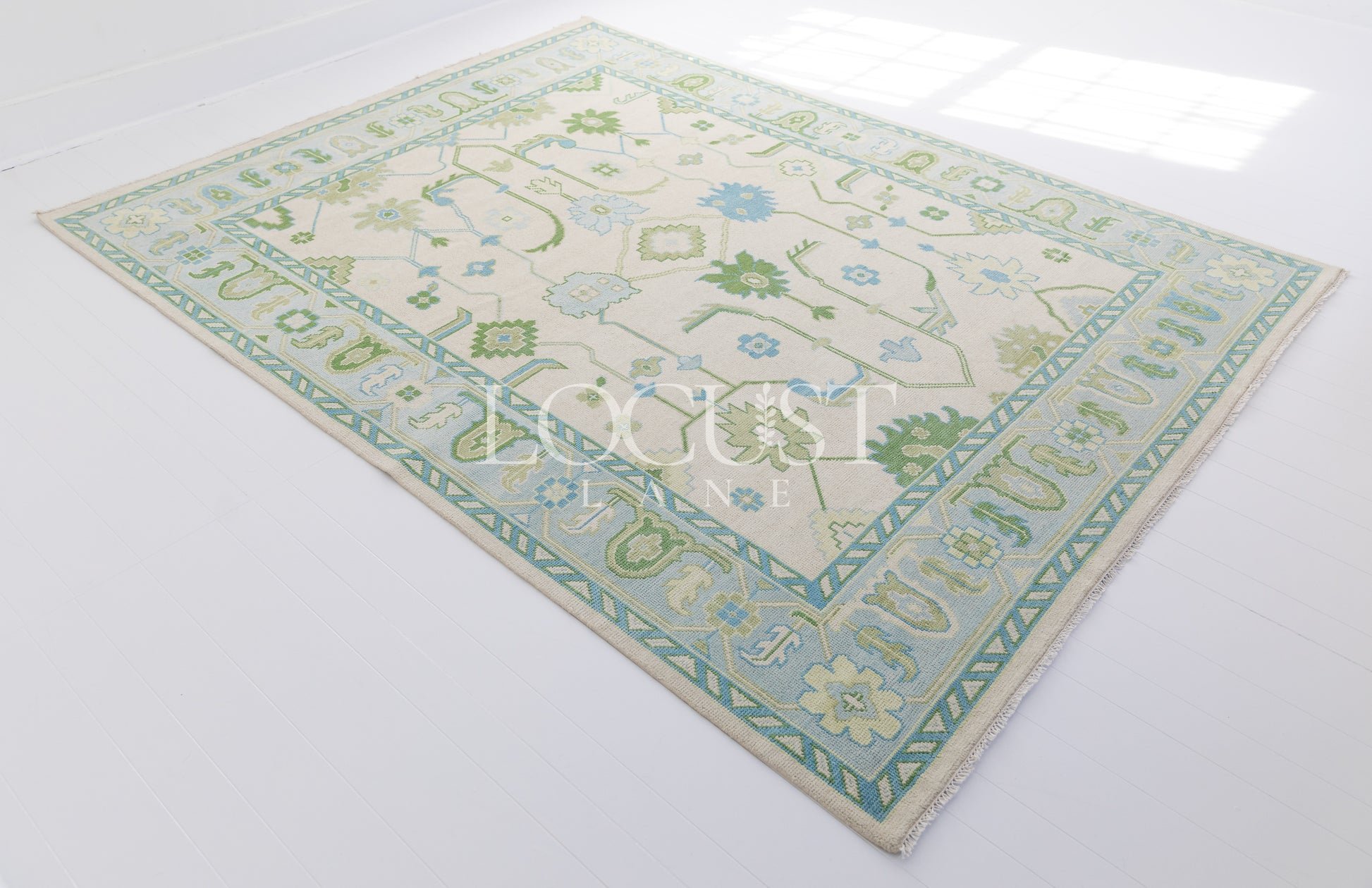 Anything but shy, Emogene bursts with energy in vivid shades of emerald, chambray, and sky. A fresh take on a traditional Oushak, this hand-knotted rug is dyed with natural vegetable pigments and woven from 100% wool for lasting beauty and impact. Her graphic border and high-contrast palette make her the statement piece every room deserves.