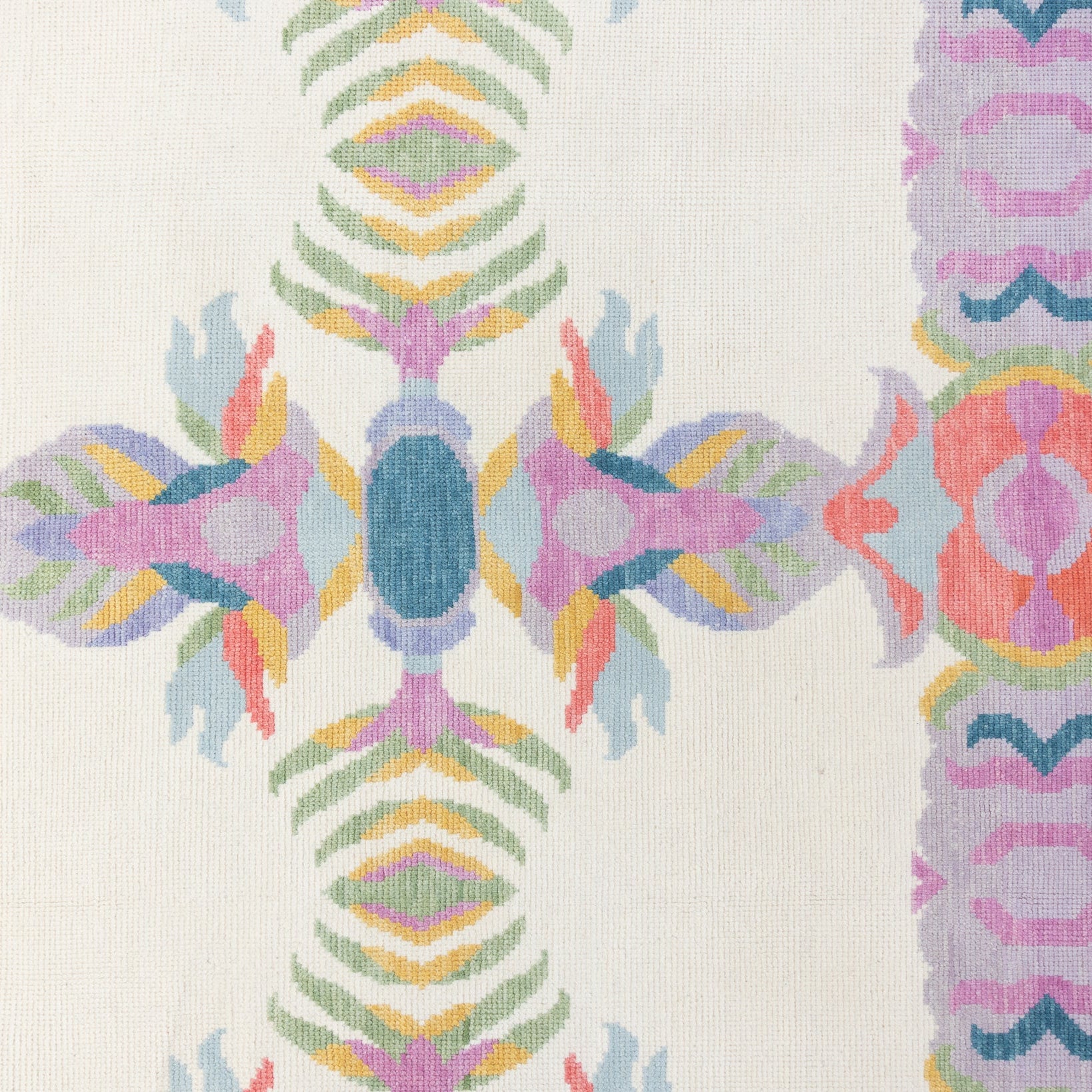 Bold, modern, and full of color, the Evie in White rug is a statement piece for vibrant interiors. Handwoven by skilled artisans, Evie features a crisp white ground that makes its striking geometric motifs pop in vivid shades of turquoise, coral, violet, sunshine yellow, and leafy green. The symmetrical design and lively palette create an energetic, playful feel while maintaining a sense of balance and refinement.