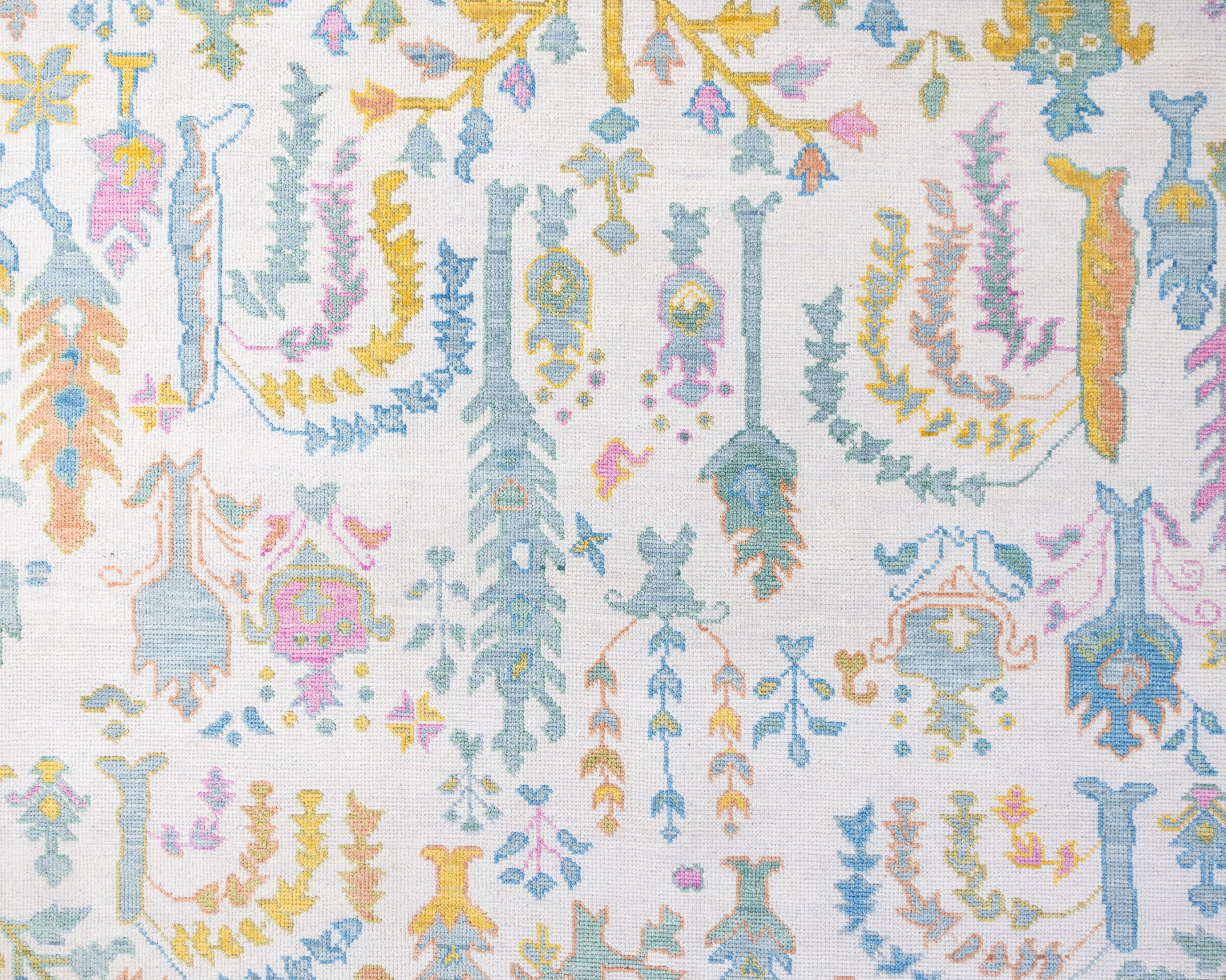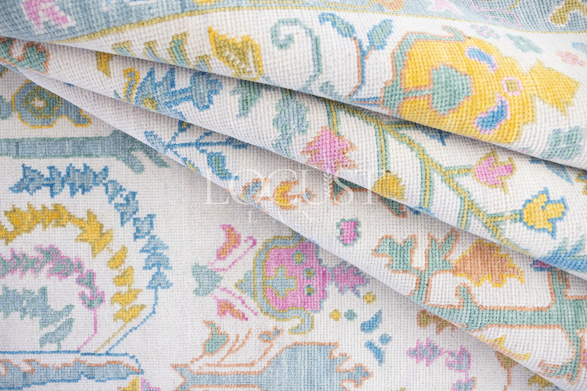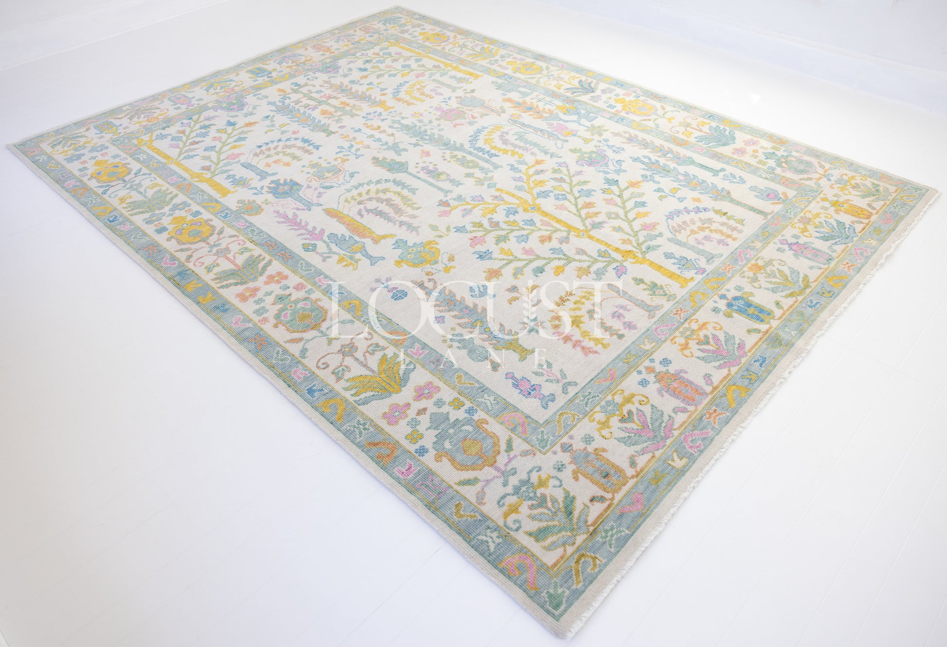 Vibrant and full of life, the Flora rug is a celebration of color and artistry. Handknotted by skilled artisans, Flora features a crisp, light background adorned with intricate botanical and vine motifs in sunny yellow, soft coral, sky blue, seafoam green, and pops of rosy pink. The design’s painterly, almost watercolor-like blending gives it a joyful, whimsical feel while maintaining a refined elegance.