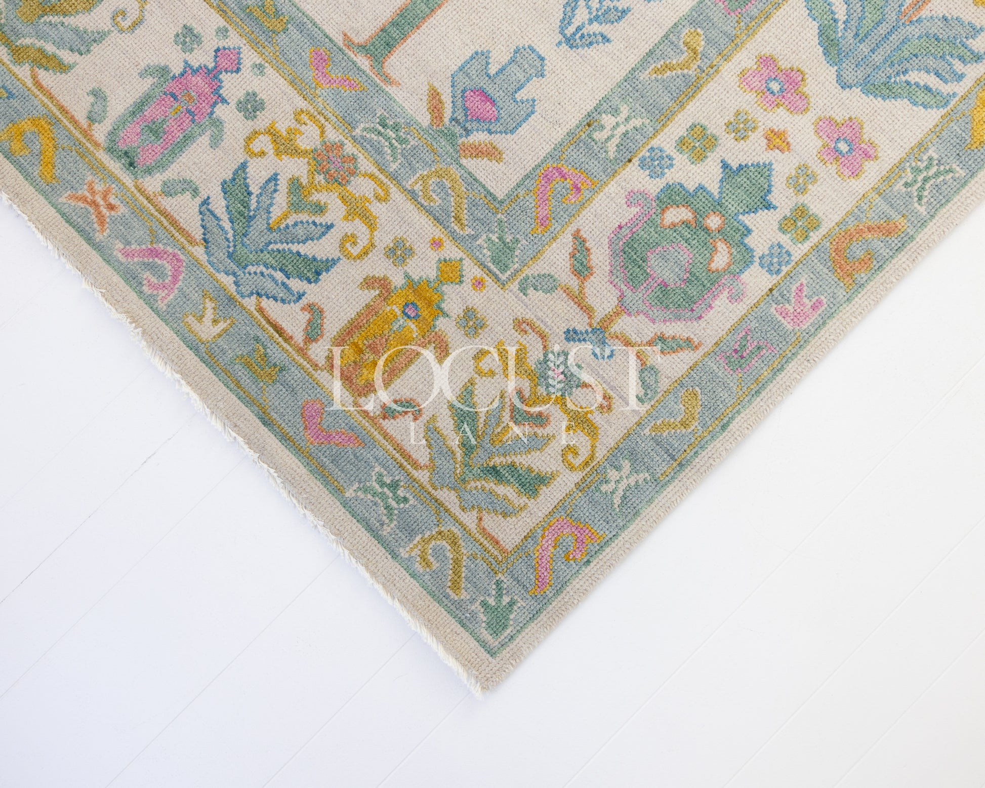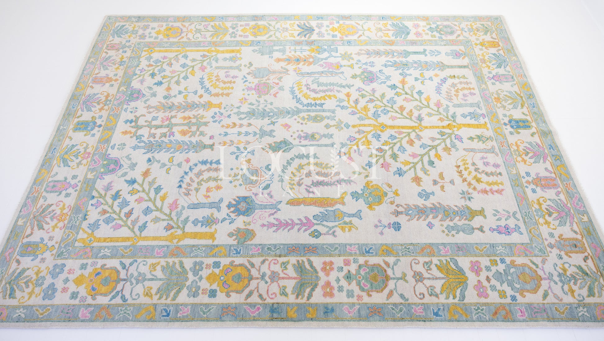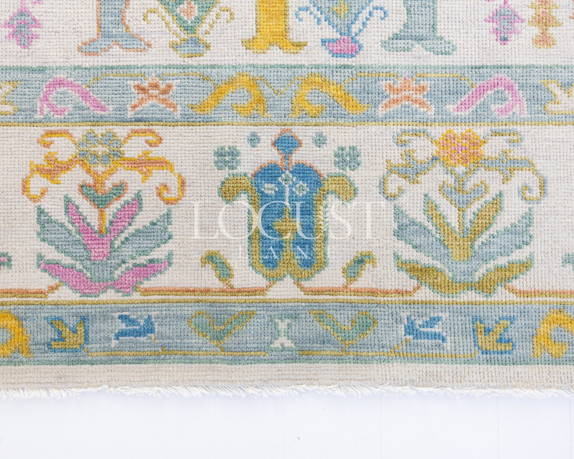 Vibrant and full of life, the Flora rug is a celebration of color and artistry. Handknotted by skilled artisans, Flora features a crisp, light background adorned with intricate botanical and vine motifs in sunny yellow, soft coral, sky blue, seafoam green, and pops of rosy pink. The design’s painterly, almost watercolor-like blending gives it a joyful, whimsical feel while maintaining a refined elegance.