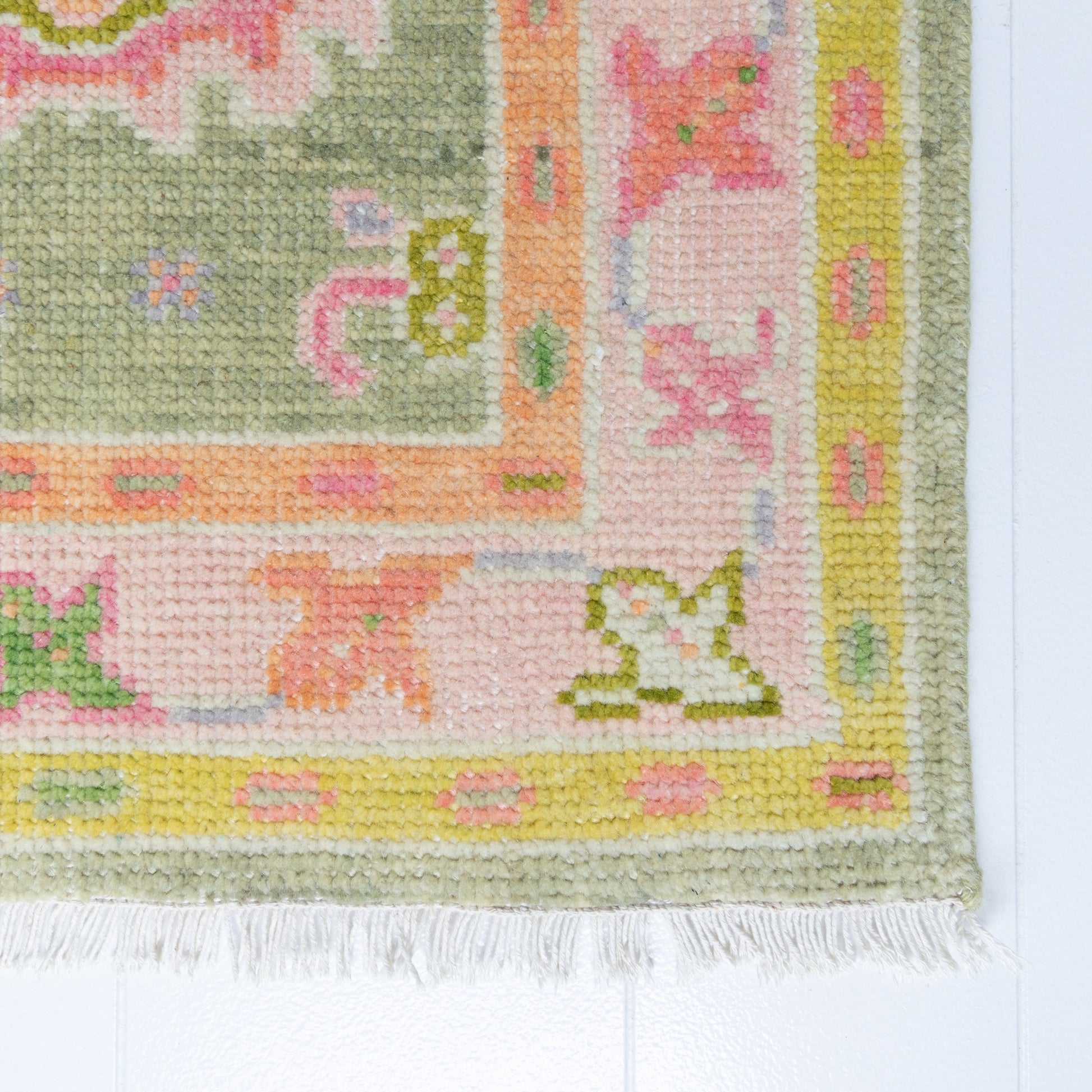 The Hillside Mini is full of warmth and personality. Hand-knotted from 100% wool in soft sage, blush, and citron tones, it brings color, texture, and character to small spaces.