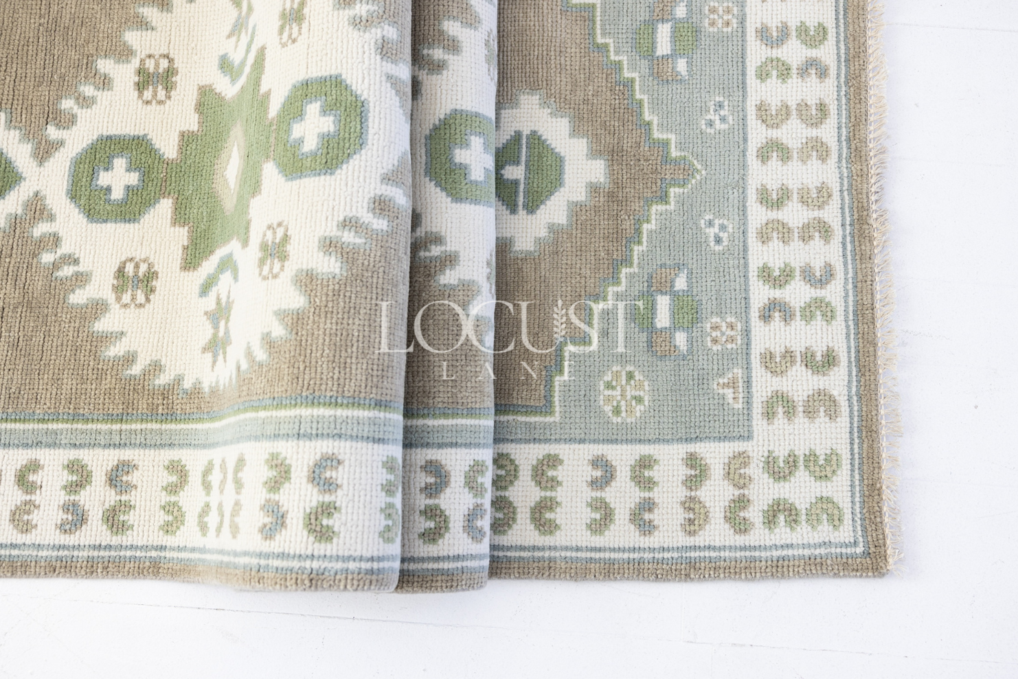 Elevate your space with the understated beauty of our Ivy rug — a handcrafted masterpiece in calming tones of sage green, soft taupe, and creamy ivory. Woven by skilled artisans, Ivy features a geometric medallion pattern and a delicate border with crescent motifs, all rendered in a soothing, earthy palette.