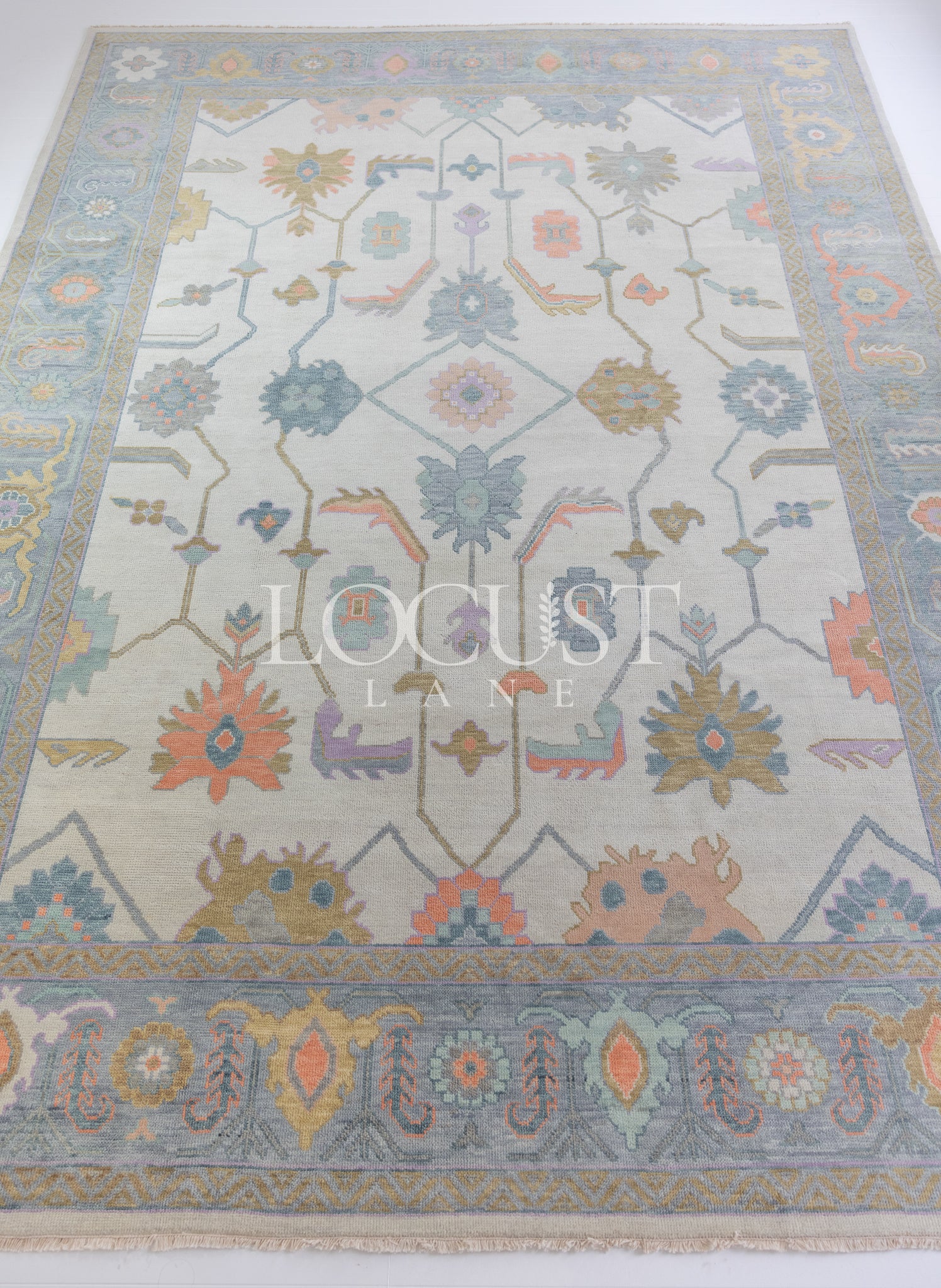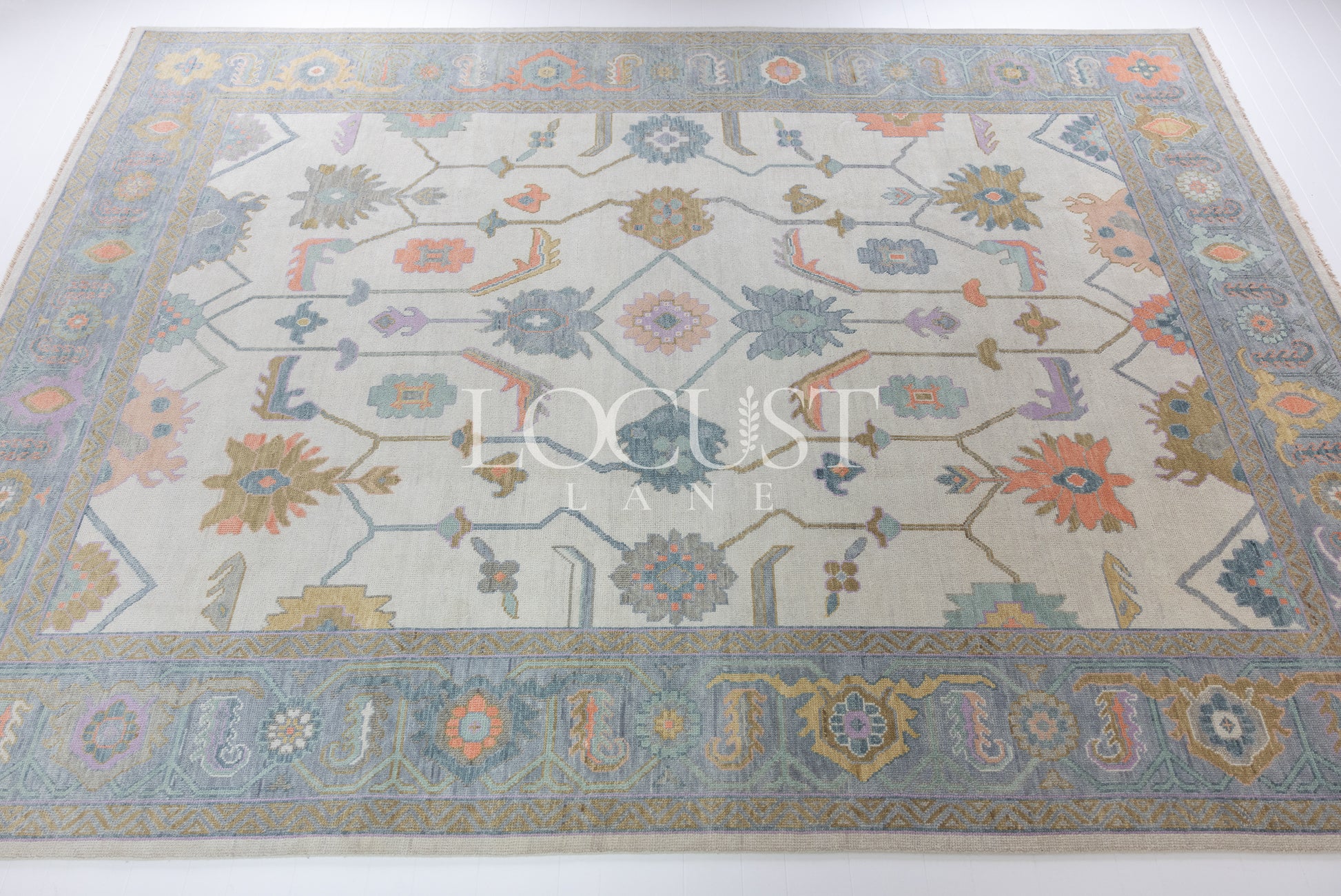 Jolene is confident, colorful, and full of personality. Hand-knotted from 100% wool and dyed with natural vegetable pigments, she features playful Oushak motifs in melon, teal, marigold, and coral—each shape standing out clearly against a cool stone ground. Her border brings structure with rich blue-grey tones and intricate detailing, grounding her vibrant spirit with a touch of tradition.