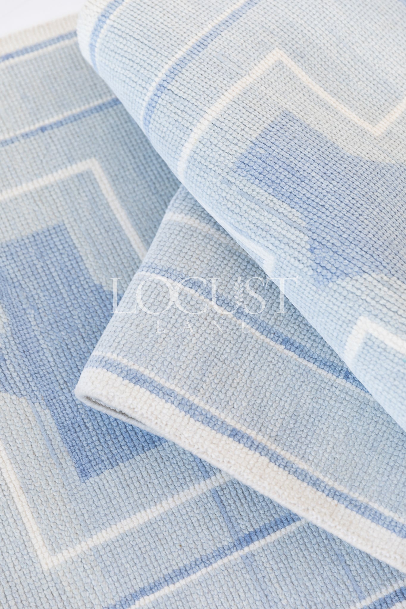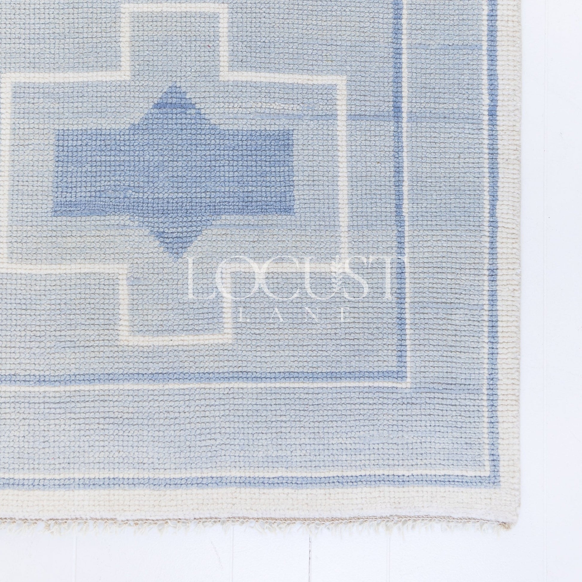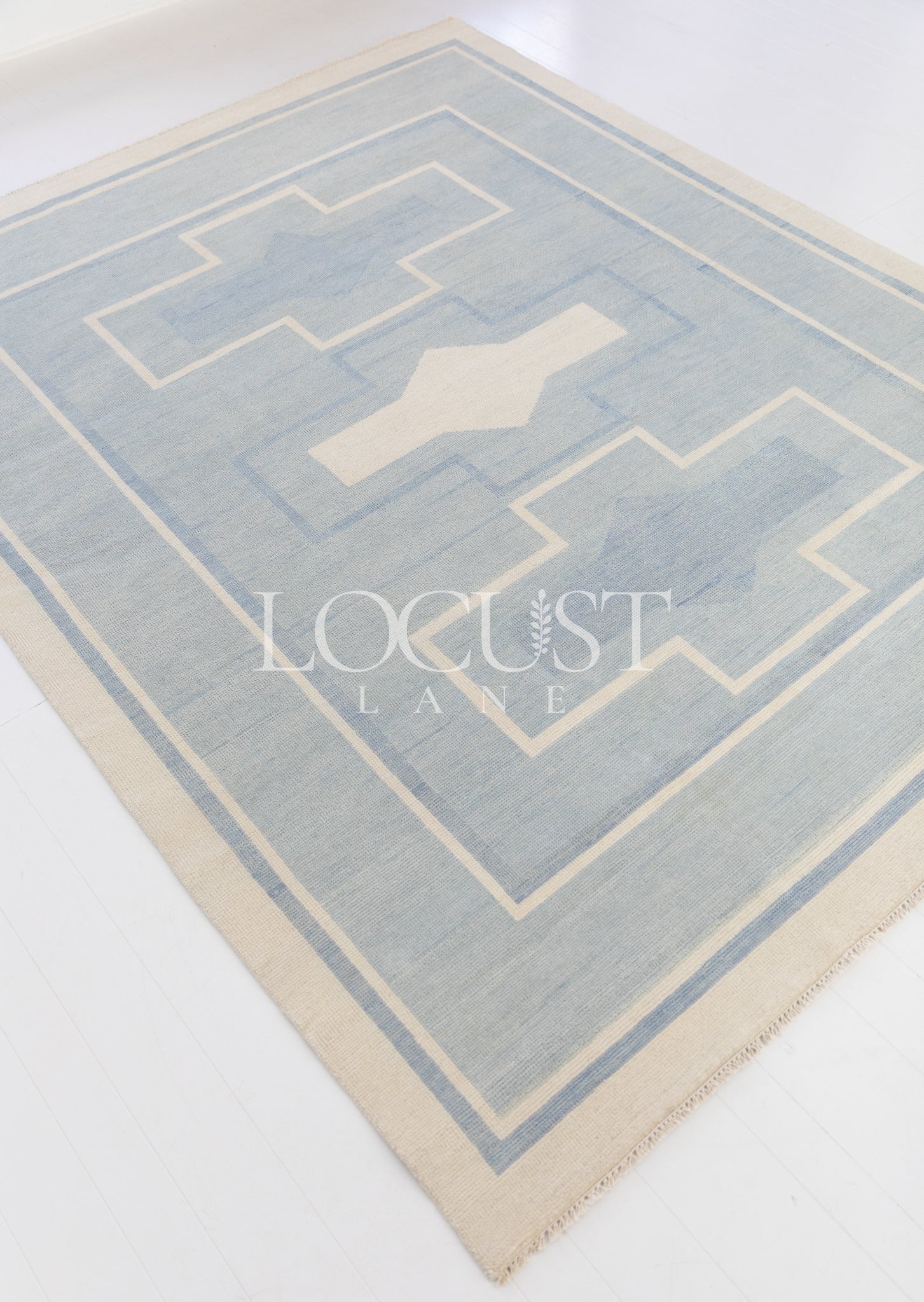 Loretta brings a fresh, coastal elegance to any space with its clean geometry and soothing palette. Handwoven in soft sky and powder blues, accented by crisp ivory, the design features a bold yet balanced stepped motif that feels both timeless and modern. The flatweave construction makes Loretta a versatile choice—perfect for high-traffic hallways, kitchens, or layered over a natural rug for added texture.