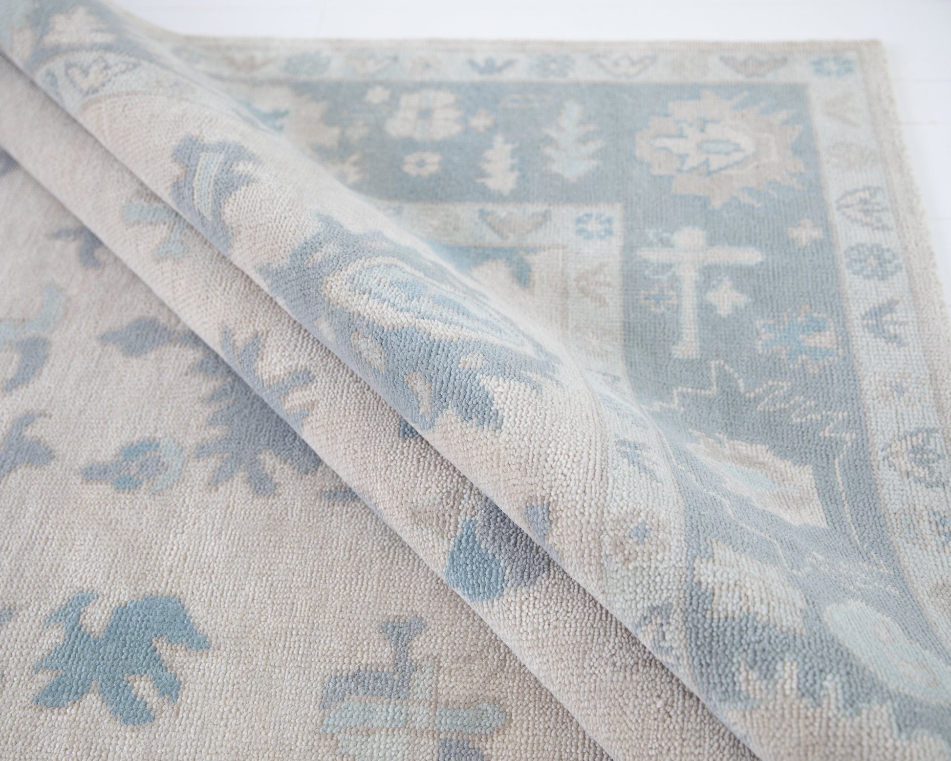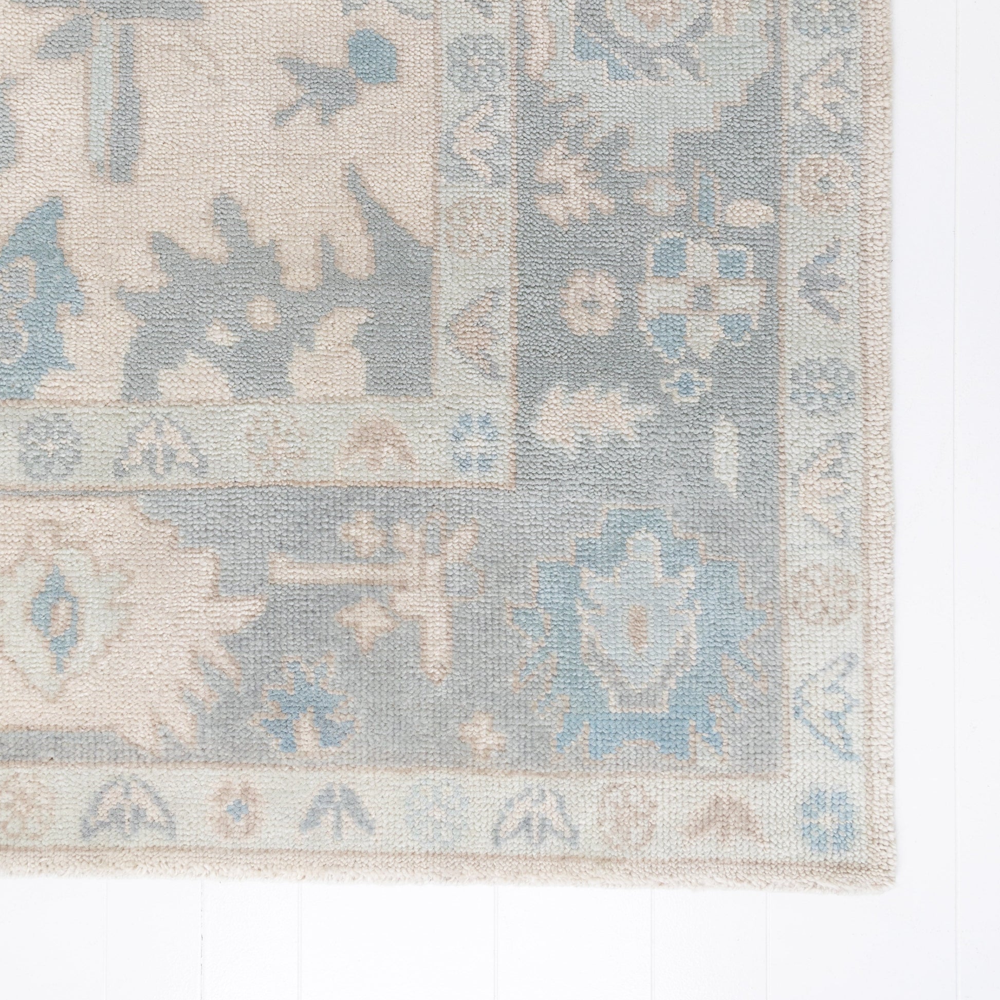 Soft and sophisticated, the Lottie rug brings timeless elegance to any space. Handknotted by skilled artisans, Lottie features a warm neutral base beautifully complemented by dusty blue, soft aqua, and gentle taupe accents. The traditional botanical and medallion motifs are framed by a coordinating border, giving the rug a balanced, harmonious look perfect for both classic and coastal-inspired interiors.