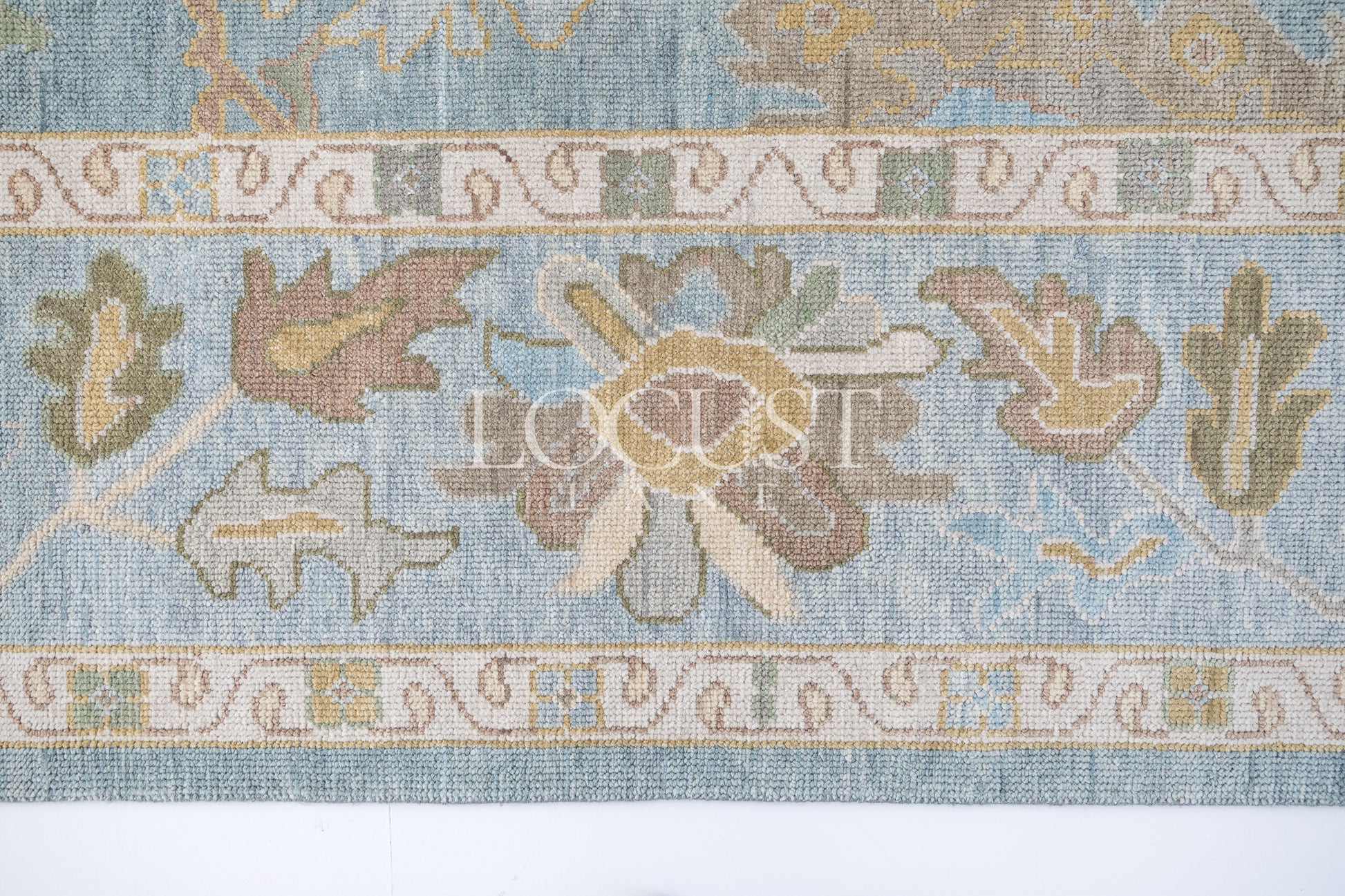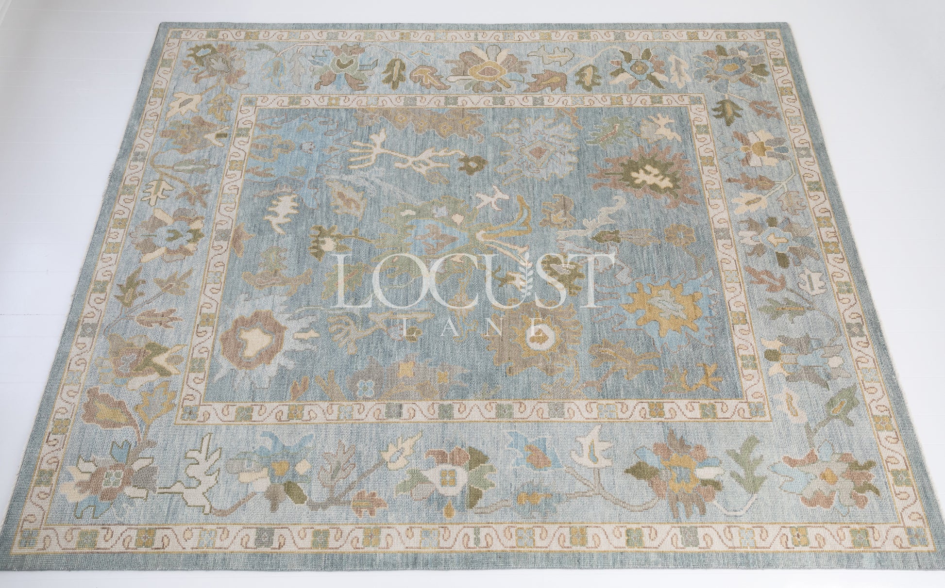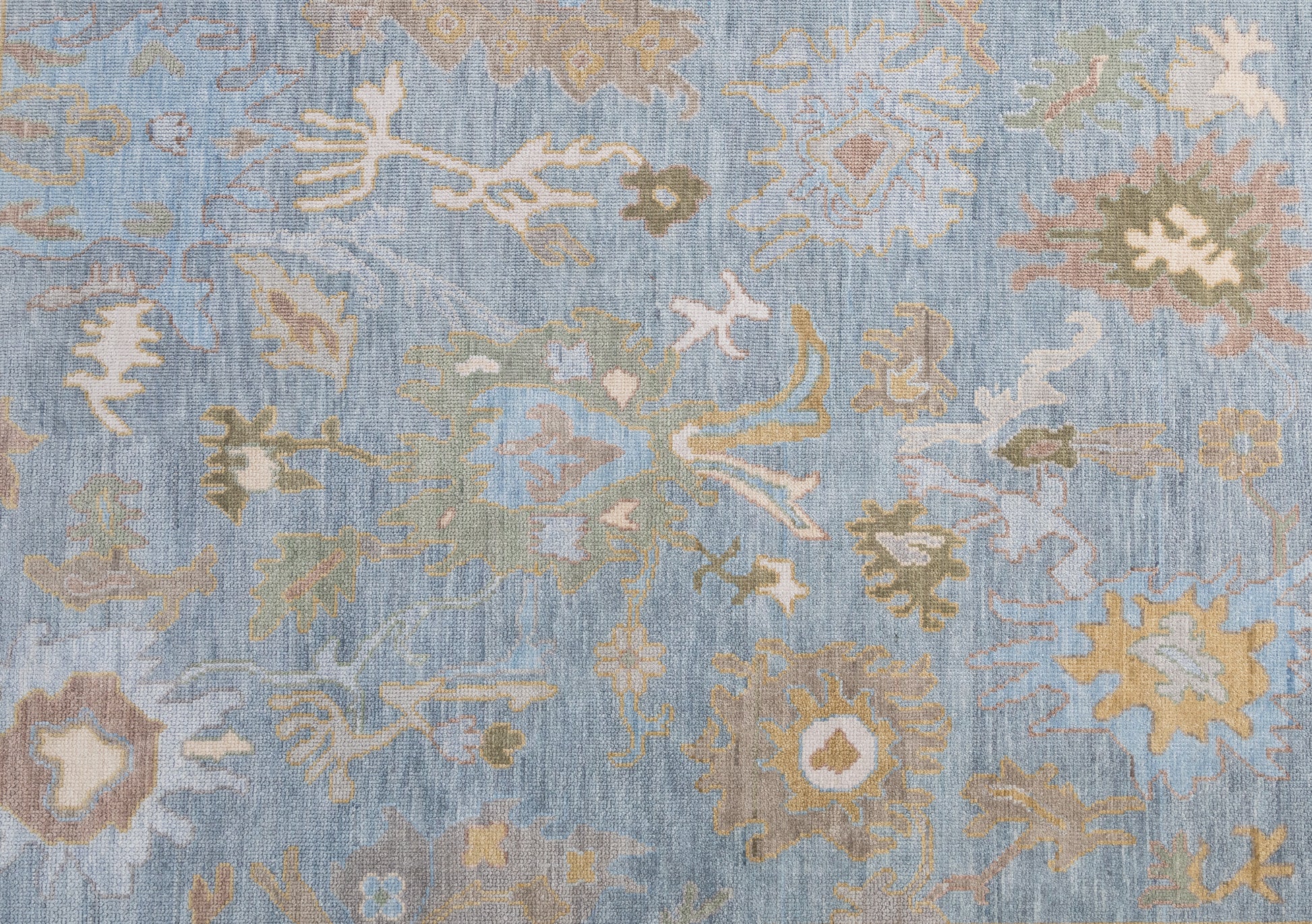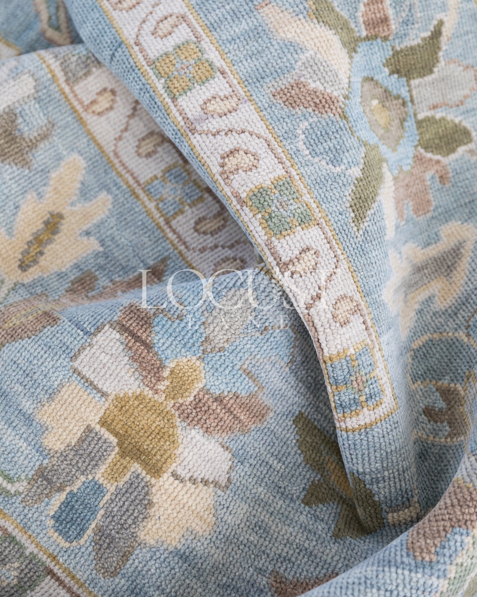 The Martha Rug blends timeless tradition with a soft, lived-in elegance. Hand-knotted by master artisans, this heirloom piece features a washed blue ground with intricate botanical motifs in earthy tones of sage, gold, and ivory. Its slightly distressed finish creates a vintage-inspired look, making it feel as though it’s been treasured for generations.