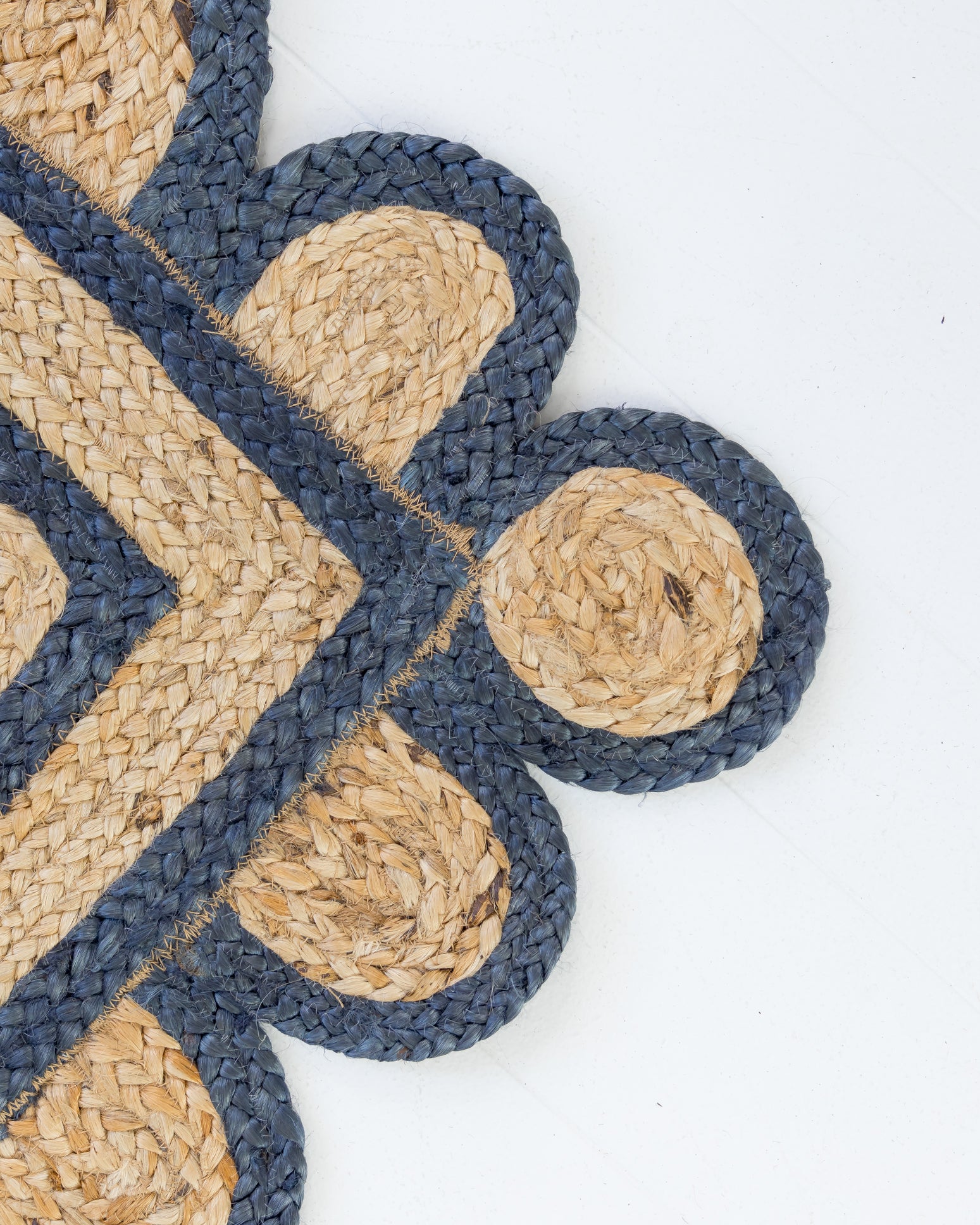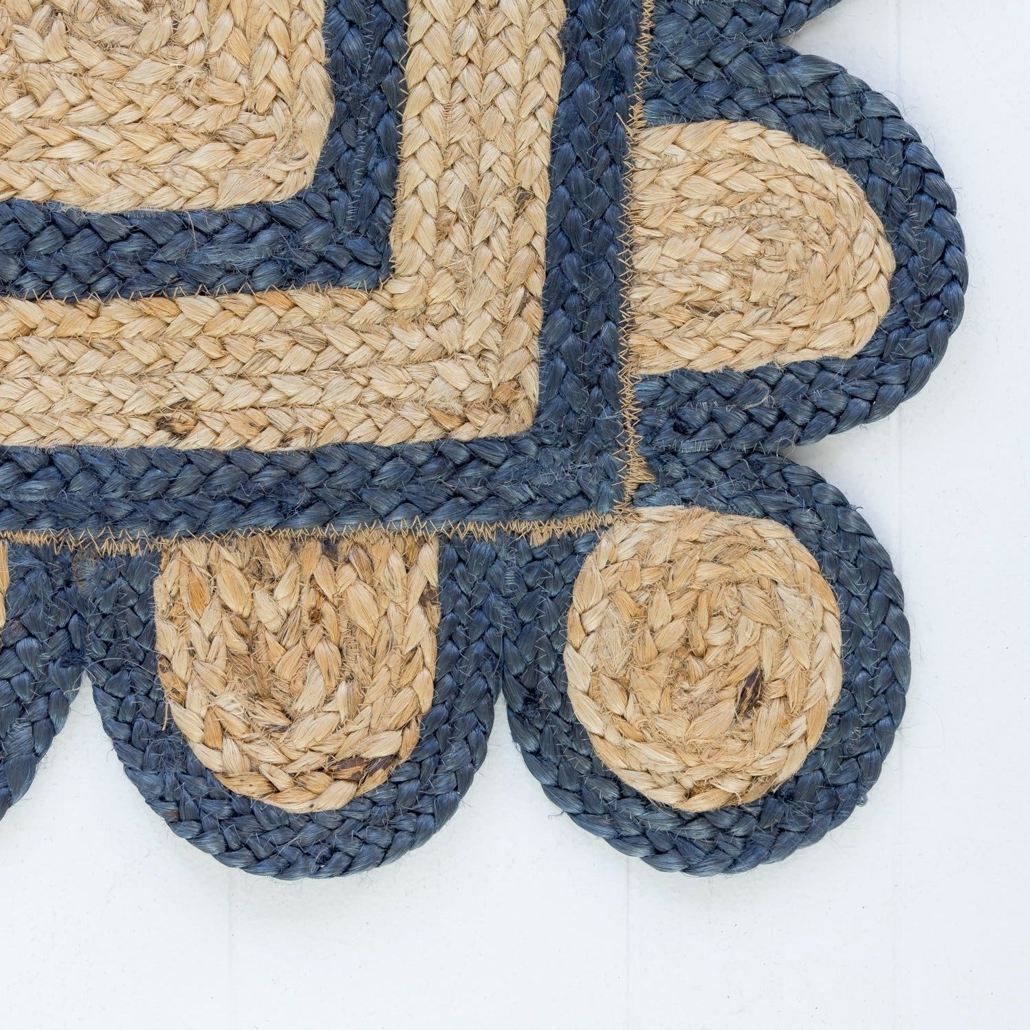 The Navy Scalloped Jute Rug combines natural texture with bold contrast. Hand-braided from durable jute fibers, its sandy-toned base is framed with deep navy scalloped edges, creating a striking yet versatile design. Perfect for adding both warmth and definition, this rug balances coastal charm with timeless sophistication.