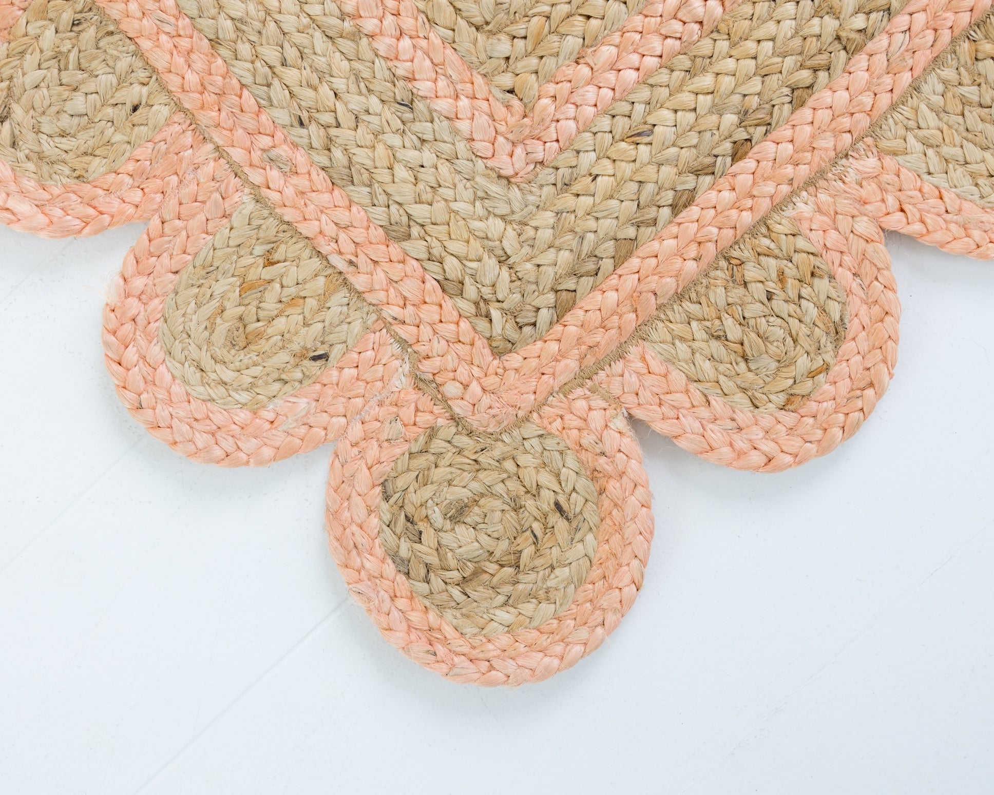The Peach Scalloped Jute Rug features a natural jute base in warm sandy tones, accented with a sun-washed peach jute trim that outlines each scalloped edge. The blend of earthy beige and soft peach creates a fresh yet grounded look, bringing both texture and a gentle pop of color to any space.