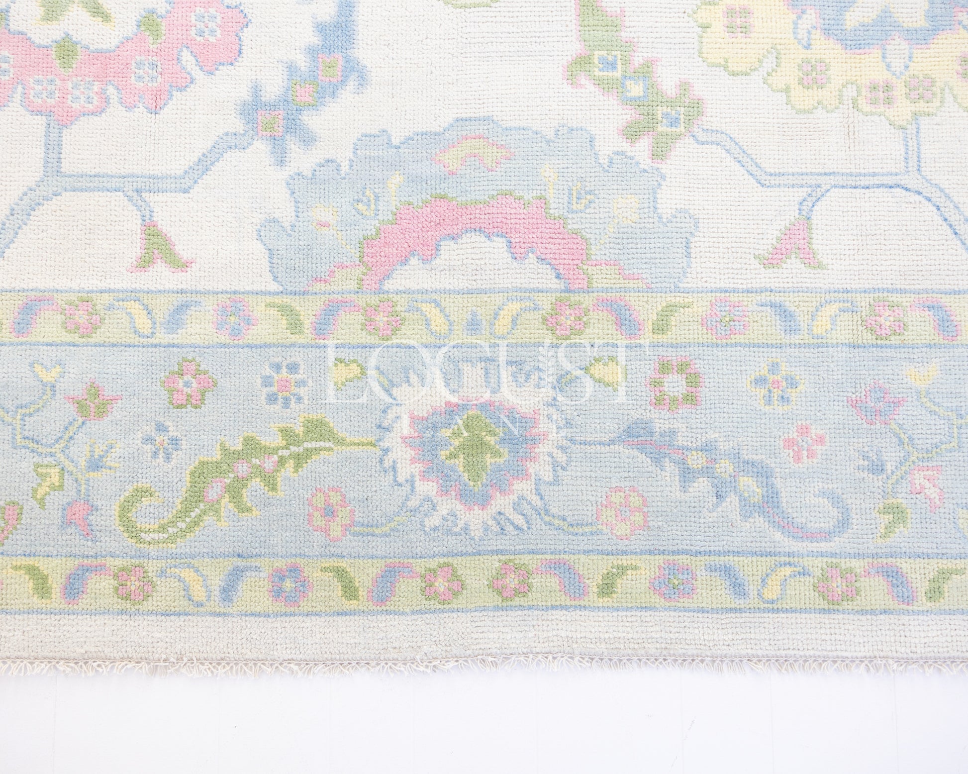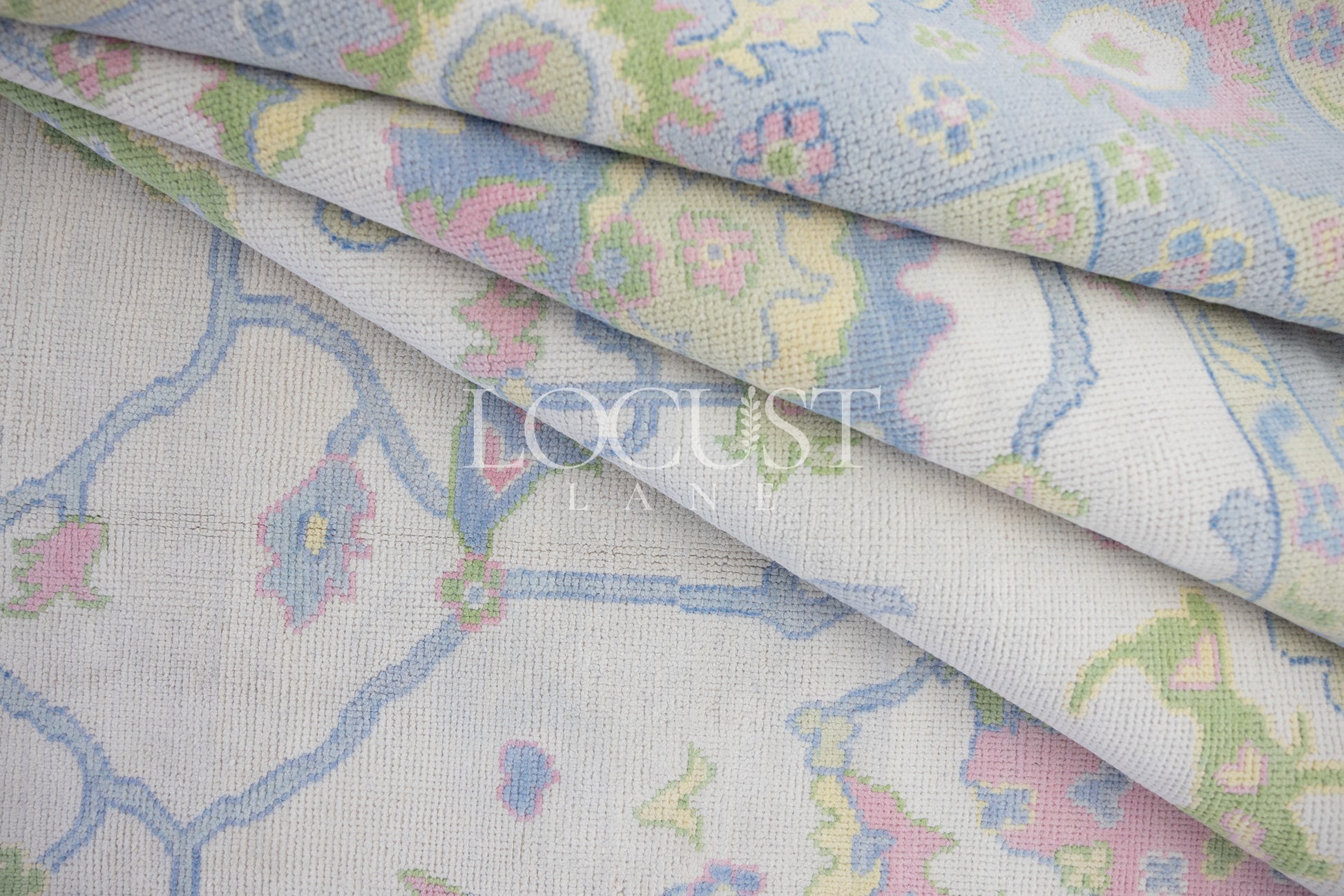 A playful twist on tradition, Riley Jane brings a modern lightness to the classic Oushak motif. Hand-knotted with care, its soft pastel palette—think sky blue, petal pink, lemon cream, and spring green—sits atop a warm ivory ground. The result is fresh, feminine, and full of charm. A beautiful way to add color and character while keeping things airy and soft.